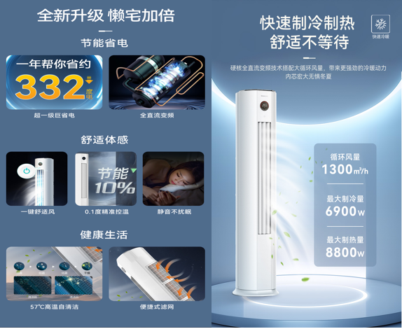 节能层面,该款柜机搭载APF值5.0的新一级能效系统,搭配升级全直流变频技术,对比三级能效空调可实现25%的省电效果,一年约能节省332度电,为家庭日常使用省下真金白银。全直流变频架构带来压缩机、内外机电机、电子膨胀阀的四重协同运行,配合每小时1300立方米的大循环风量,既实现快速制冷制热,无需久等就能调至舒适温度,又能保持低耗运行,同时静音运转不打扰家人春节闲谈的温馨氛围。