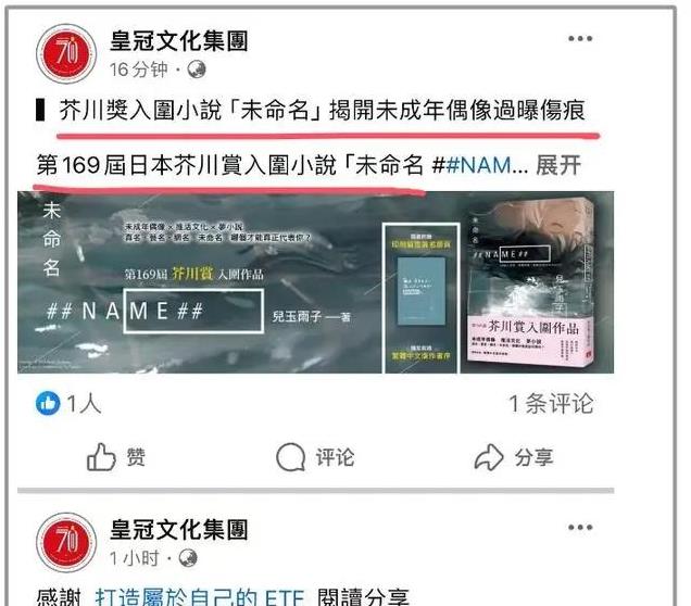 12月9日,皇冠文化集团连发多条动态宣传新书,其中一本便是日本芥川赏入围小说《未命名》。
