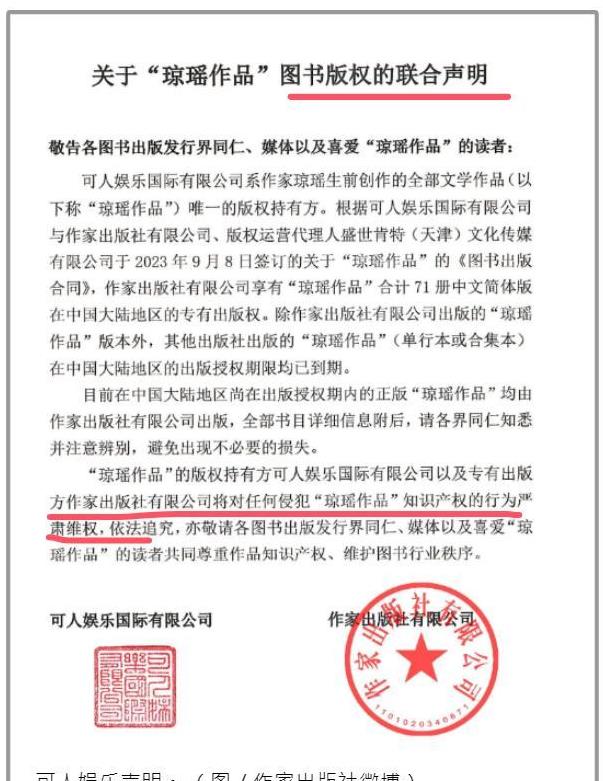 不仅如此,她还发布了正式声明,表示琼瑶71册中文简体版的版权都在作家出版社有限公司,其他公司的版权都已经到期。