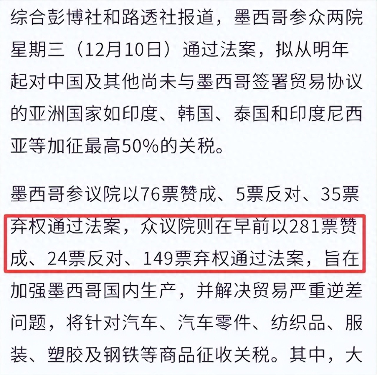 墨西哥国会高票通过关税法案的来龙去脉这法案不是临时起意,早几个月就酝酿了。墨西哥众议院在12月10日凌晨通过,281票赞成、24票反对、149票弃权。