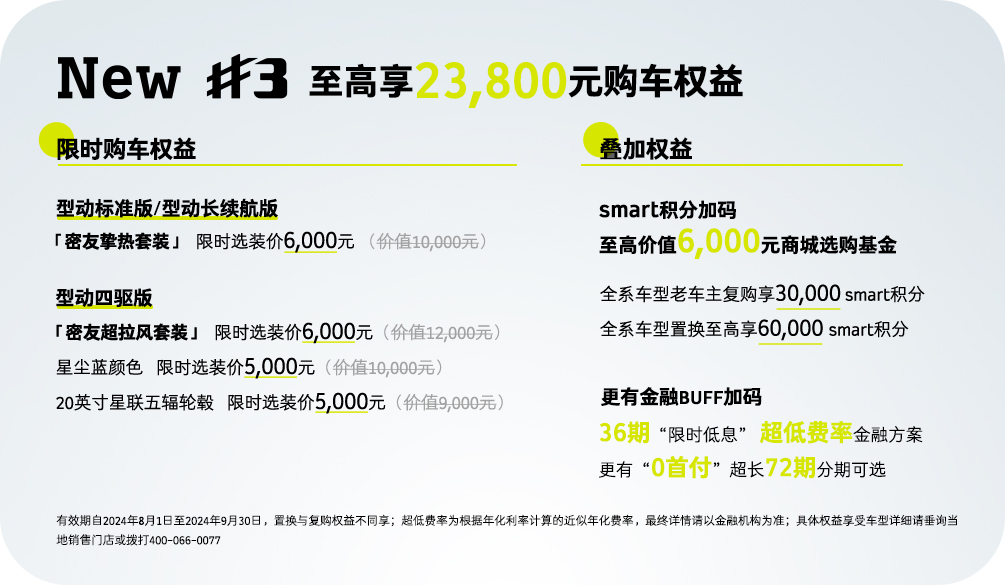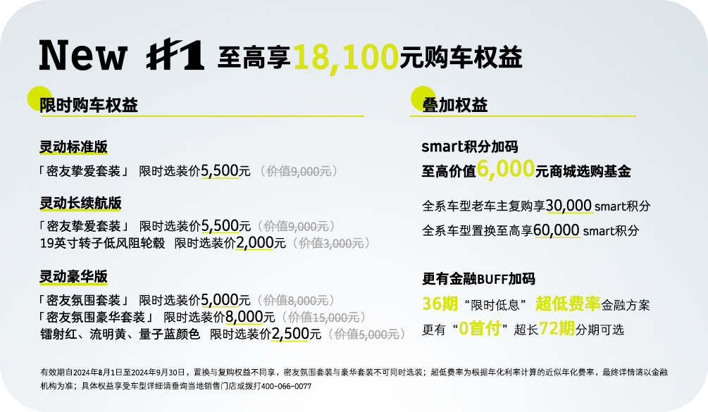 让豪华品质走向大众,让新奢出行触手可及。smart精灵#1及#3产品系列在15.49万元起(不含付费选装)的官方零售价基础上,限时推出多重权益加码:8月1日-9月30日新定车的密友,可享密友套装、特殊颜色及轮毂限时选装权益,置换权益,复购权益等超多福利;更有“0首付”、超长72期分期、限时低息等多种金融方案。此外,恰逢建军节、教师节,军人、教师购车还可额外享受至高2500元现金减免,助力更多密友轻松唤醒夏日活力。