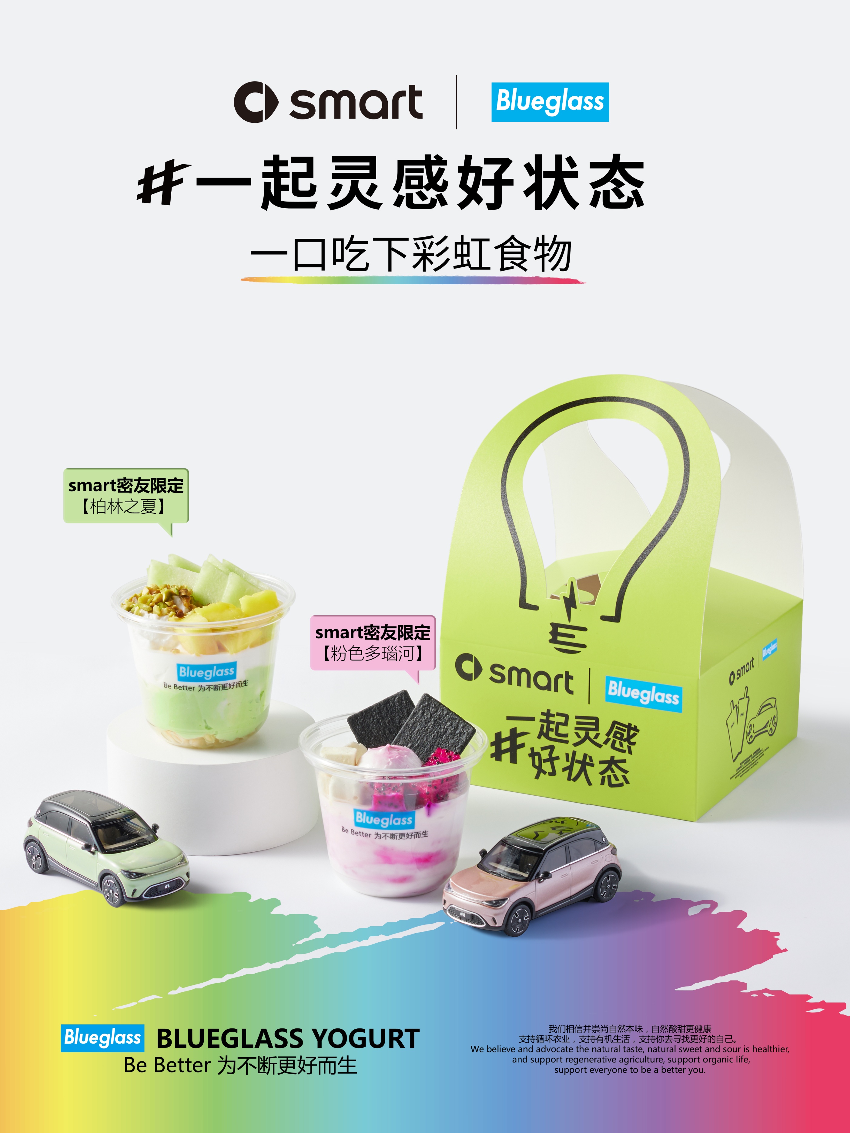 smart口味酸奶是什么味道?来Blueglass尝一下吧!以smart经典车色“波普粉”和“时光绿”为灵感,smart携手Blueglass共创推出创意十足的同款配色定制酸奶,一口下去瞬间提神醒脑,满血复活。