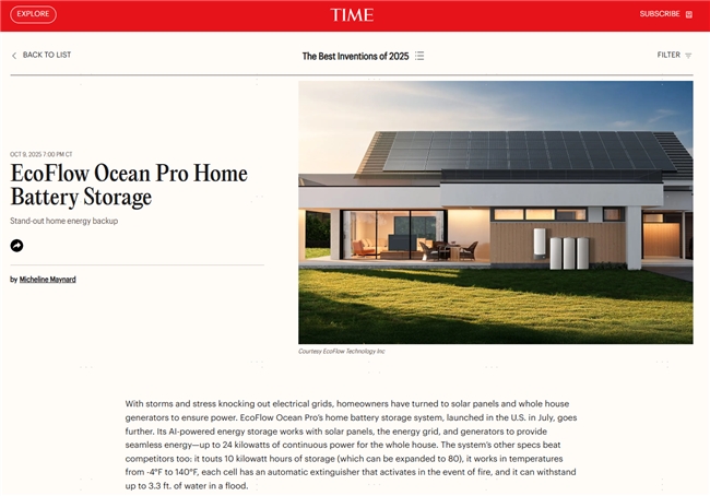 《时代》杂志编辑团队与全球记者每年从能源、健康、人工智能等多个领域提名并评估创新产品,并根据原创性、实用性、突破性与影响力进行严格筛选。OCEAN Pro 凭借其智能化、一体化的家用储能设计和卓越性能,从众多参选产品中脱颖而出。