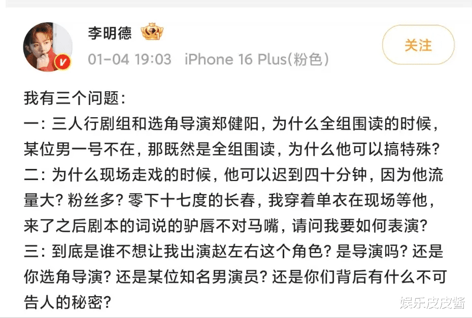 起因演员李明德在接受不了一些拍戏的规则之后,直接怒斥发文,爆料演员马先生拍戏迟到耍大牌,然后就对自己做演员期间的一些过往进行了阐述。