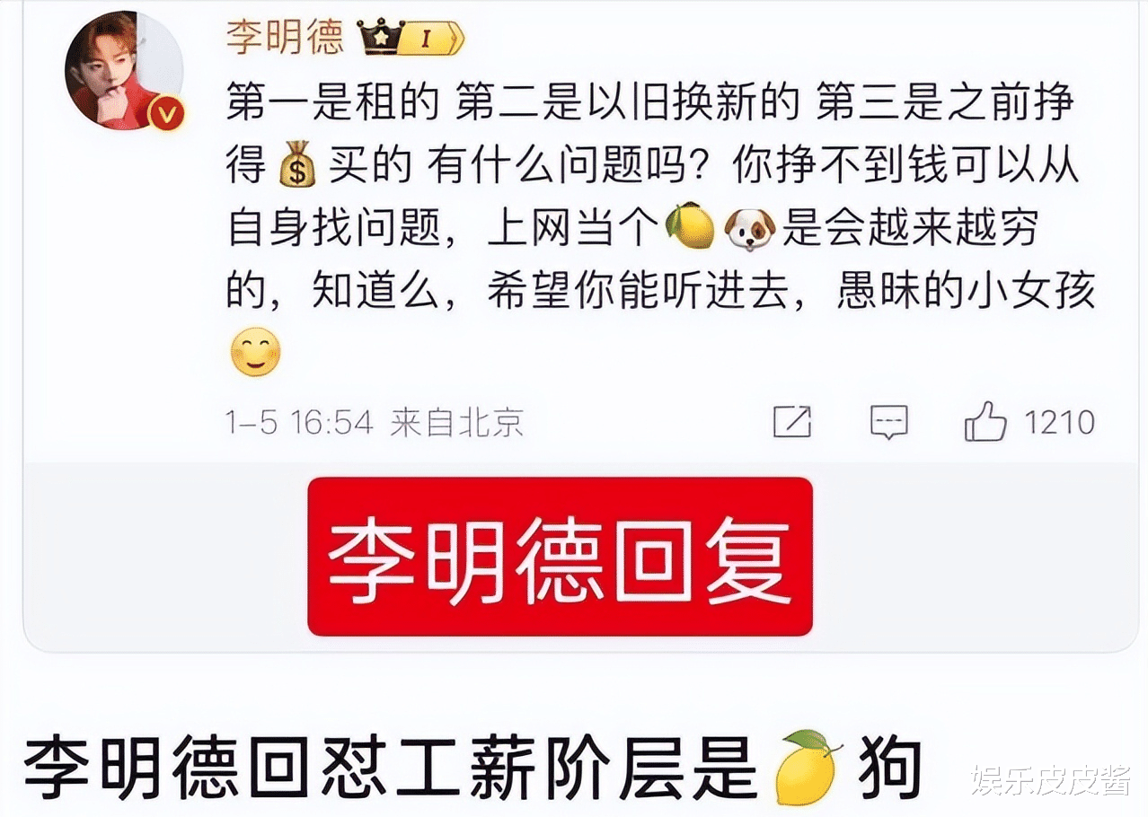 反噬口口声声说自己是最底层的人,拿着三千块钱的工资,银行卡里没有二百块钱,但实际上被网友扒出李明德开豪车,穿上万的衣服,就连一副眼镜就得上千元,这可不是所谓的穷人,妥妥的有钱人呀。