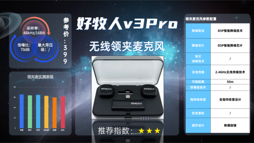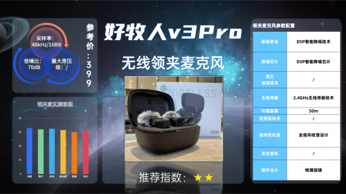 1:好牧人v3Pro给人的第一感觉就是“简洁不繁琐”。它采用2.4G传输芯片,实现即插即用的便捷体验,无需复杂调试,新手拿到即可上手;搭载基础降噪算法,能有效压制室内空调、键盘等基础杂音,满足室内口播、短视频录制等简单场景的收音需求。
