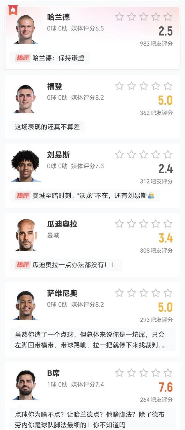 赛后的球员评分中,曼城将帅都普遍低分,哈兰德射失点球被吐槽,瓜迪奥拉也是无奈,只有b席尔瓦的分数差强人意,曼城加油吧,相信你们会成功的!