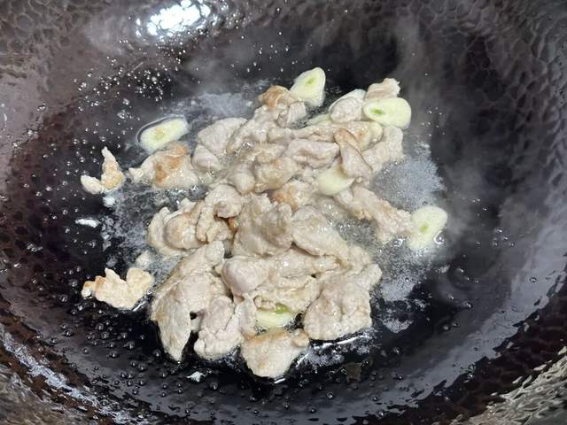 2、热锅凉油,下入一些鸡肉翻炒均匀,炒熟之后加入蒜片翻炒出香味;如果没有鸡肉换成猪里脊肉也可以的;
