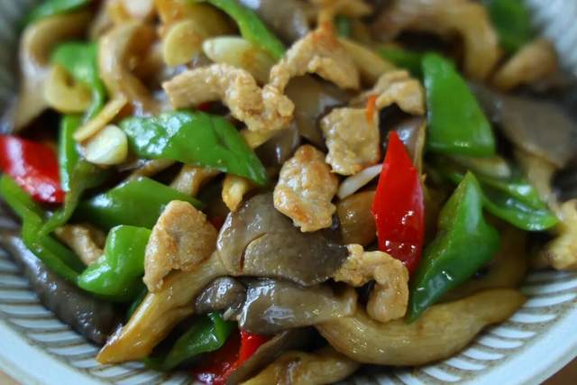 【制作配料】平菇一份 青椒一个 红椒一个 鸡肉适量 大蒜2个 生抽1勺 老抽半勺 蚝油一勺 海盐1勺 淀粉2勺 白胡椒粉适量 姜粉适量