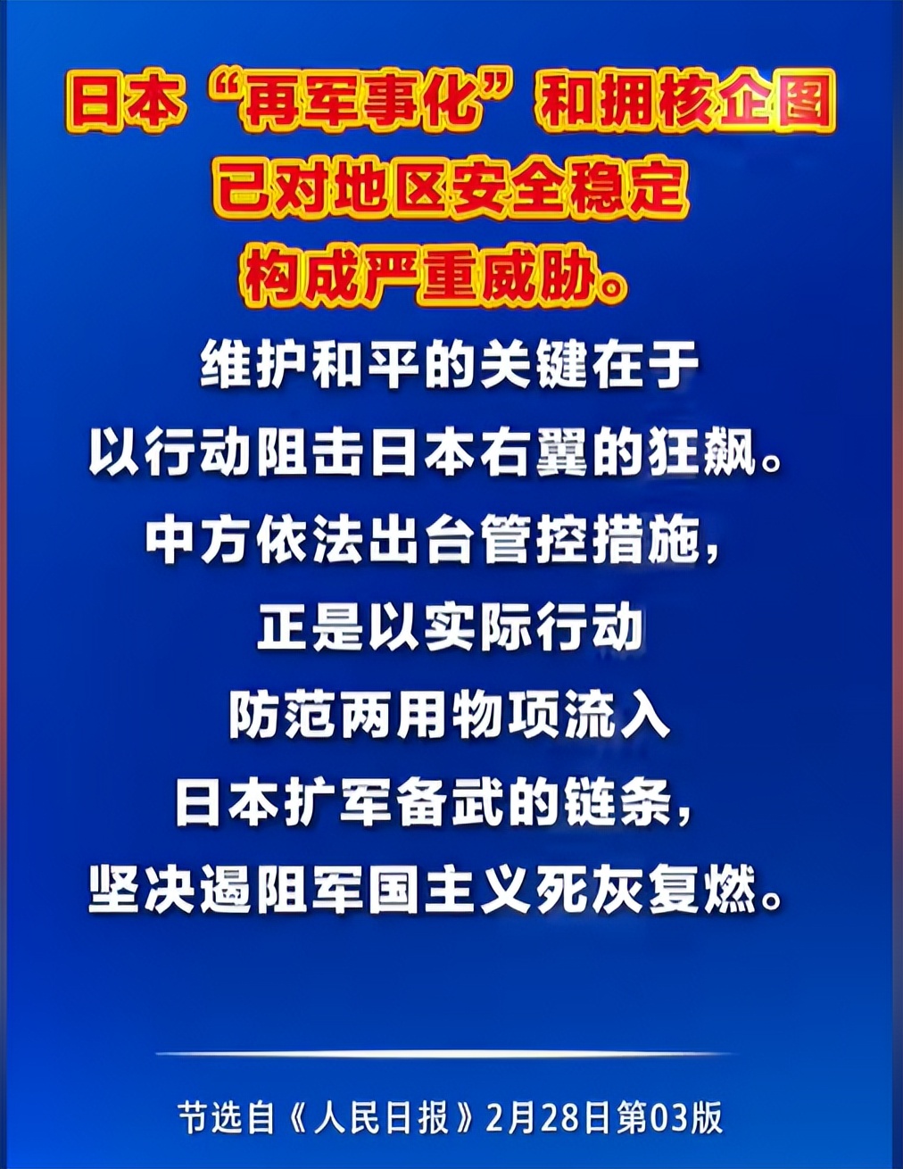 3月11日,中国国防部新闻发言人正告日本:穷兵黩武的老路是自取灭亡的不归路。商务部早已出手,将三菱重工、川崎重工等二十多家参与导弹研发的日本实体列入出口管制名单,切断供应链,精准打击。