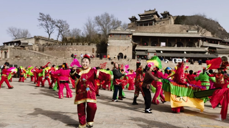 上午10时许,随着一阵急促的鼓点响起,来自周边村镇的秧歌队伍纷纷亮出“压箱绝活”。队员们身着绣满牡丹、祥云的戏服,头戴缀着绒球、流苏的彩饰,脸上涂着浓淡相宜的油彩,眉眼间笑意盈盈,眼角眉梢都透着喜庆。走在最前面的是舞龙队,十几个汉子举着一条十几米长的红龙,跟着鼓点上下翻飞,引得路边的孩子追着跑。丑角方阵是队伍里的“开心果”,几个队员扮成孙悟空、猪八戒,手里拿着简易的金箍棒和九齿钉耙,跟在后面蹦蹦跳跳,时不时冲路边的姑娘、孩子扮个鬼脸,惹得大家哈哈大笑。跑旱船的演员踩着碎步,彩船随着身体的起伏轻轻摇晃,艄公在旁边比划着划桨的动作,嘴里还喊着简单的号子,活像真的在黄河上摆渡。这支长长的秧歌队伍,从西头游客中心广场出发,一路巡演一路欢腾,让游客零距离感受黄土民俗的鲜活与热闹。