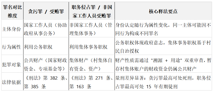 乡村振兴背景下,村级组织年均经手涉农资金超1.2万亿元(农业农村部2024年数据),基层"微腐败"案件中67%的争议集中于村干部主体身份认定(中央纪委国家监委2024年《基层职务犯罪审判白皮书》)。当村支书协助政府开展土地征收、村民小组组长管理扶贫资金、村合作社负责人参与国有土地经营时,其行为究竟构成贪污罪还是职务侵占罪、受贿罪还是非国家工作人员受贿罪?