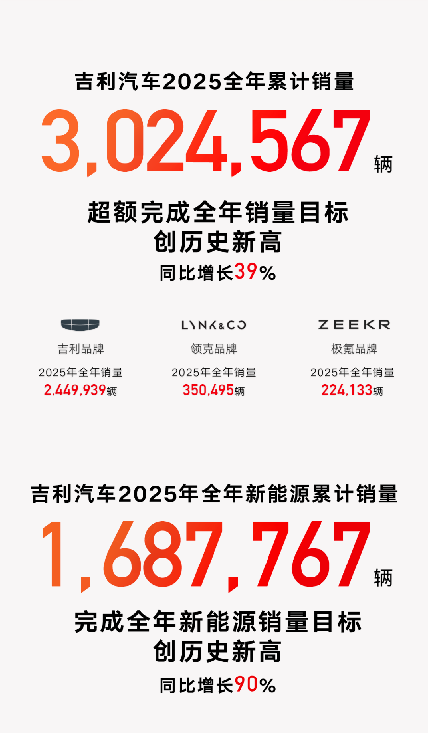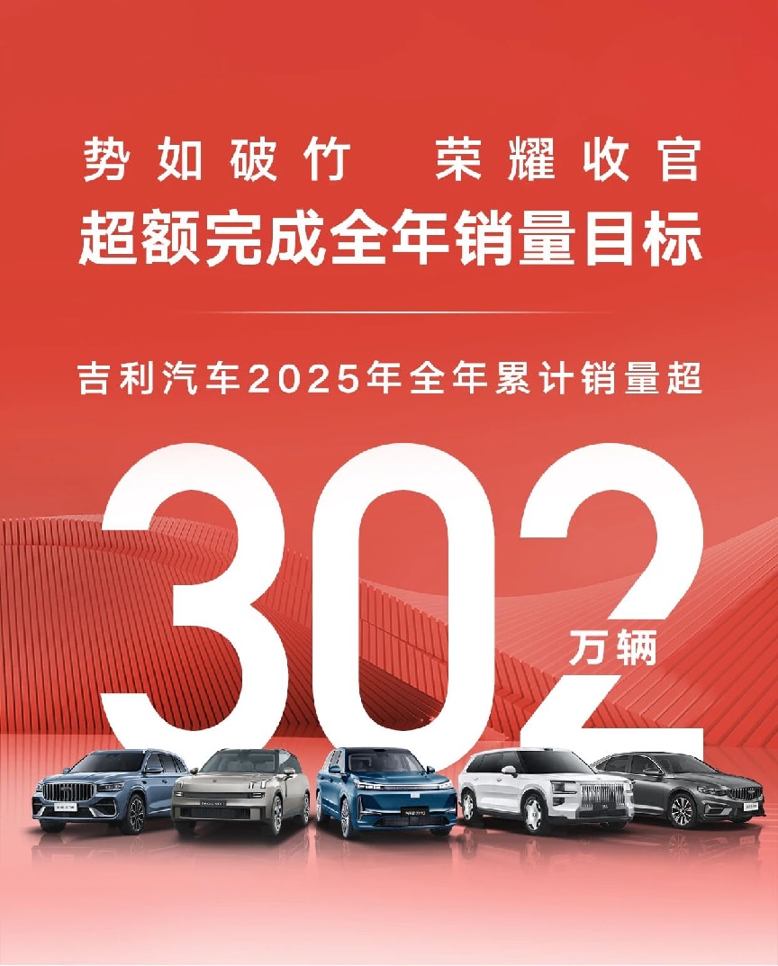 荣耀收官!吉利汽车2025年全年累计销量超302万辆,超额完成全年销售目标,2026年冲击总销量345万辆!