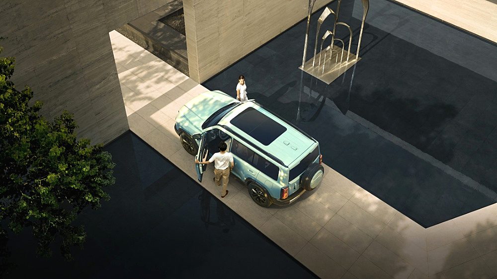 前脸部分,家族标志性的五孔式进气格栅与环形LED大灯组紧密结合,极具辨识度。车身侧面线条平直流畅,采用悬浮式车顶设计,外挂式全尺寸备胎和F型立体尾灯则进一步强化了越野属性和力量感。