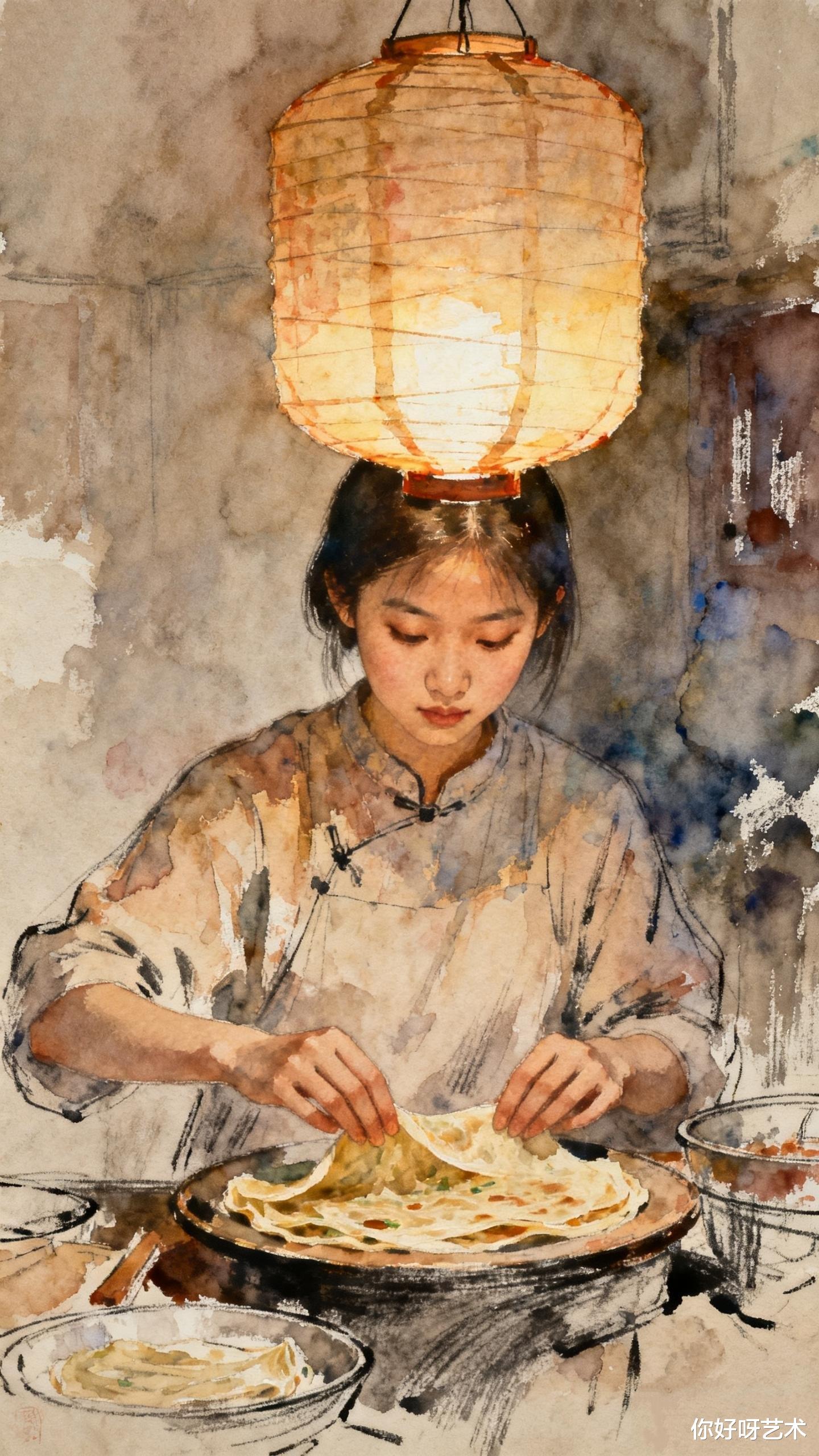 “阿青,火候要文武火交替。”祖母的声音从里屋传来,带着老式火炕的暖意。阿青应着声,将面团擀成薄如蝉翼的圆片,撒上细碎的葱花和虾皮。她总爱在春饼里藏些“秘密”——有时是晒干的桂花,有时是碾碎的核桃,今日却只放了半勺猪油,说是“要让春饼带着水彩的香气”。锅里的油花噼啪炸响,阿青握着锅铲的手微微发抖,却不是因为热,而是因为锅铲上沾着的颜料——那是她昨夜调色时,不小心蹭上的靛蓝。