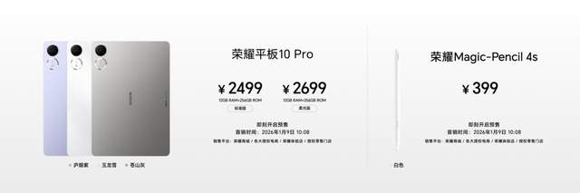 荣耀平板10 Pro于1月9日10:08全渠道正式开售,12GB+256GB标准版售价2499元、12GB+256GB柔光版售价2699元,全新手写笔荣耀Magic-Pencil 4s售价399元;此次将所有配置都升级为新春礼盒套装,12GB+256GB礼盒版现价2499元,12GB+256GB柔光礼盒版现价2699元,购买即赠荣耀Magic-Pencil 4s手写笔;荣耀平板X10 Pro于1月9日10:08全渠道正式开售,8GB+128GB版本售价1499元、8GB+256GB版本售价1699元、8GB+256GB柔光版售价1899元。