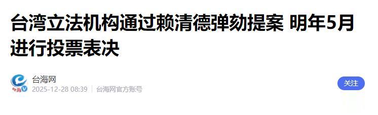12月26日,台“立法院”爆发激烈对决,国民党与民众党罕见联手,以60票对51票通过了对赖清德的弹劾案。