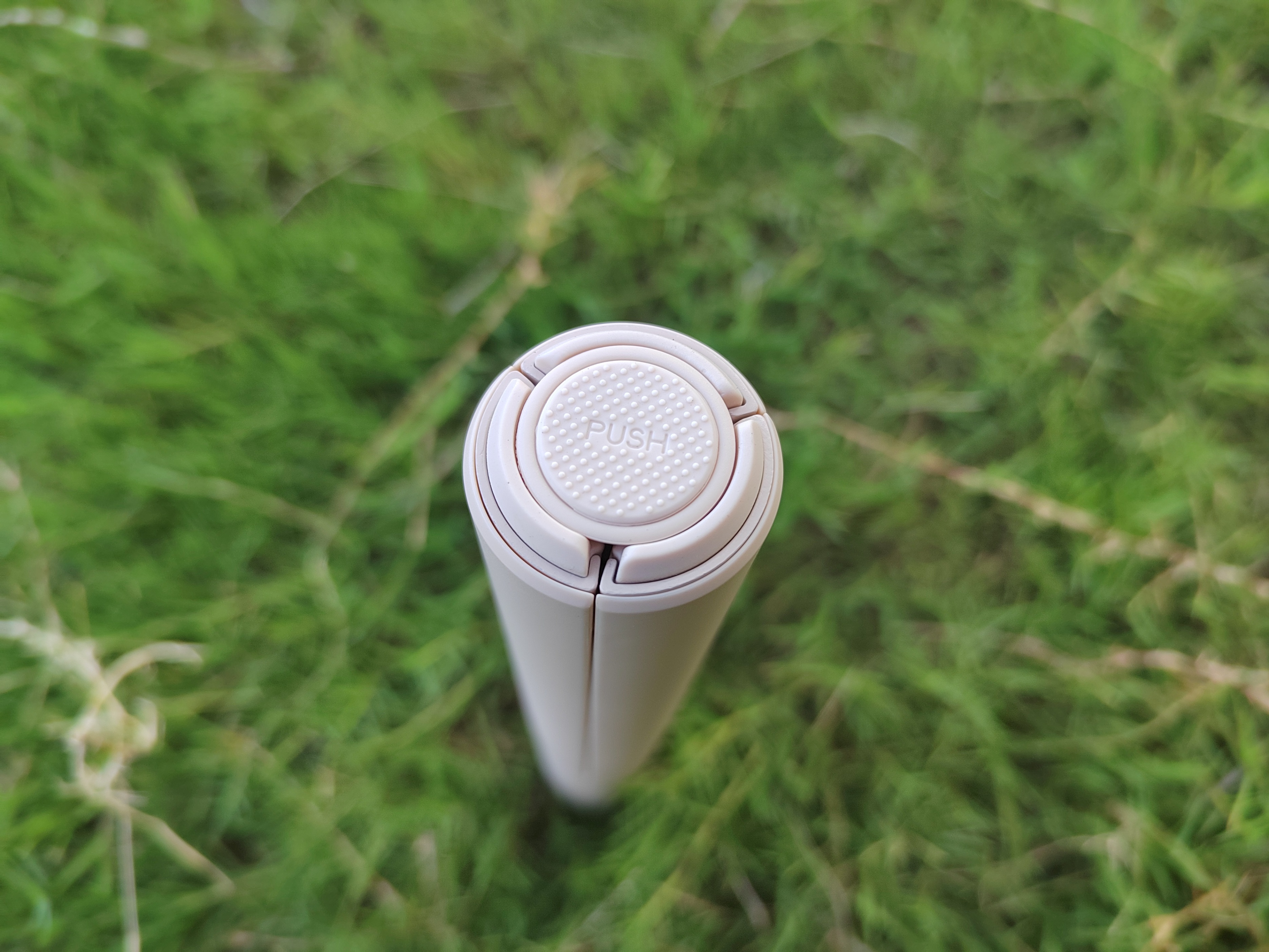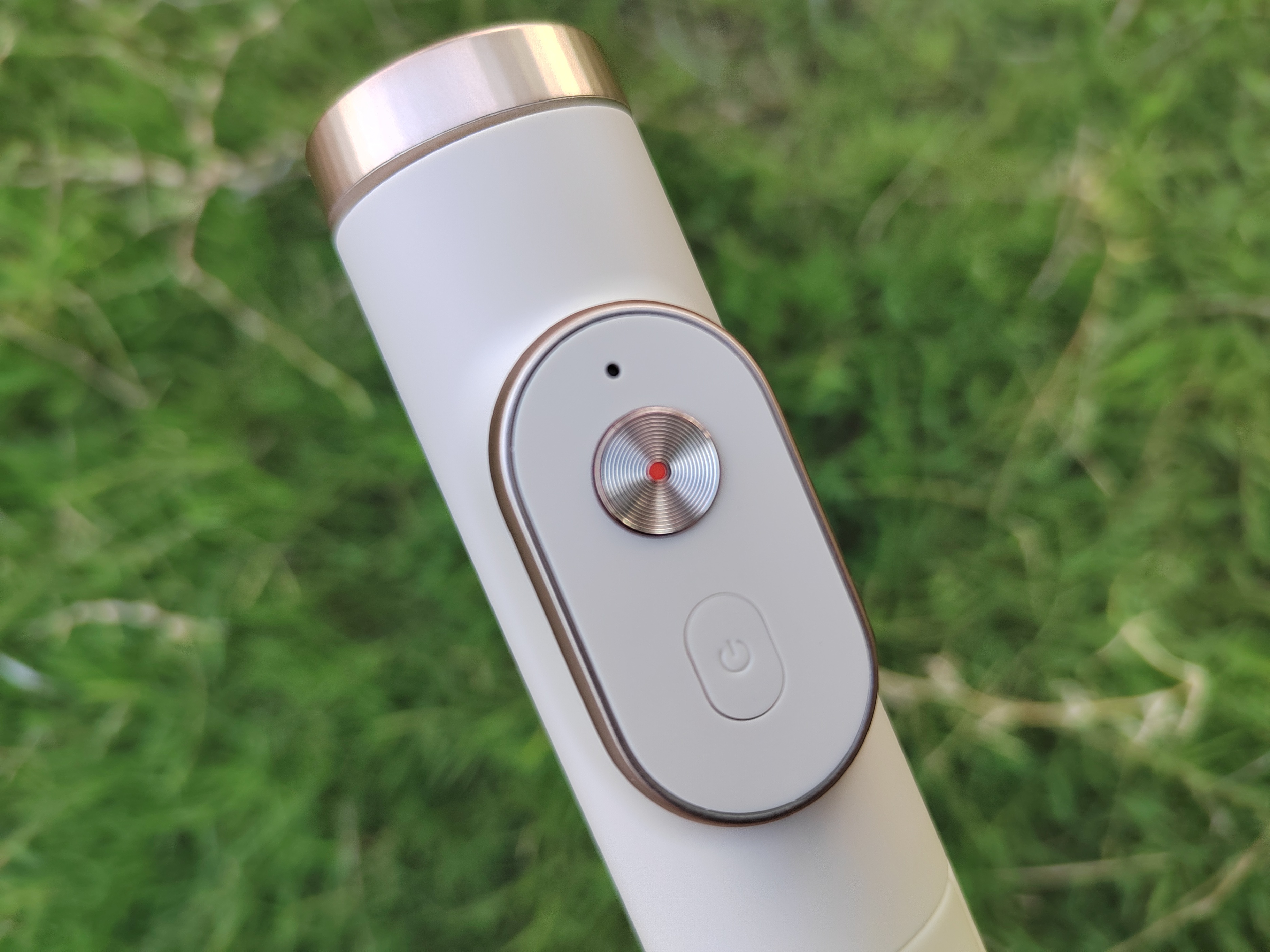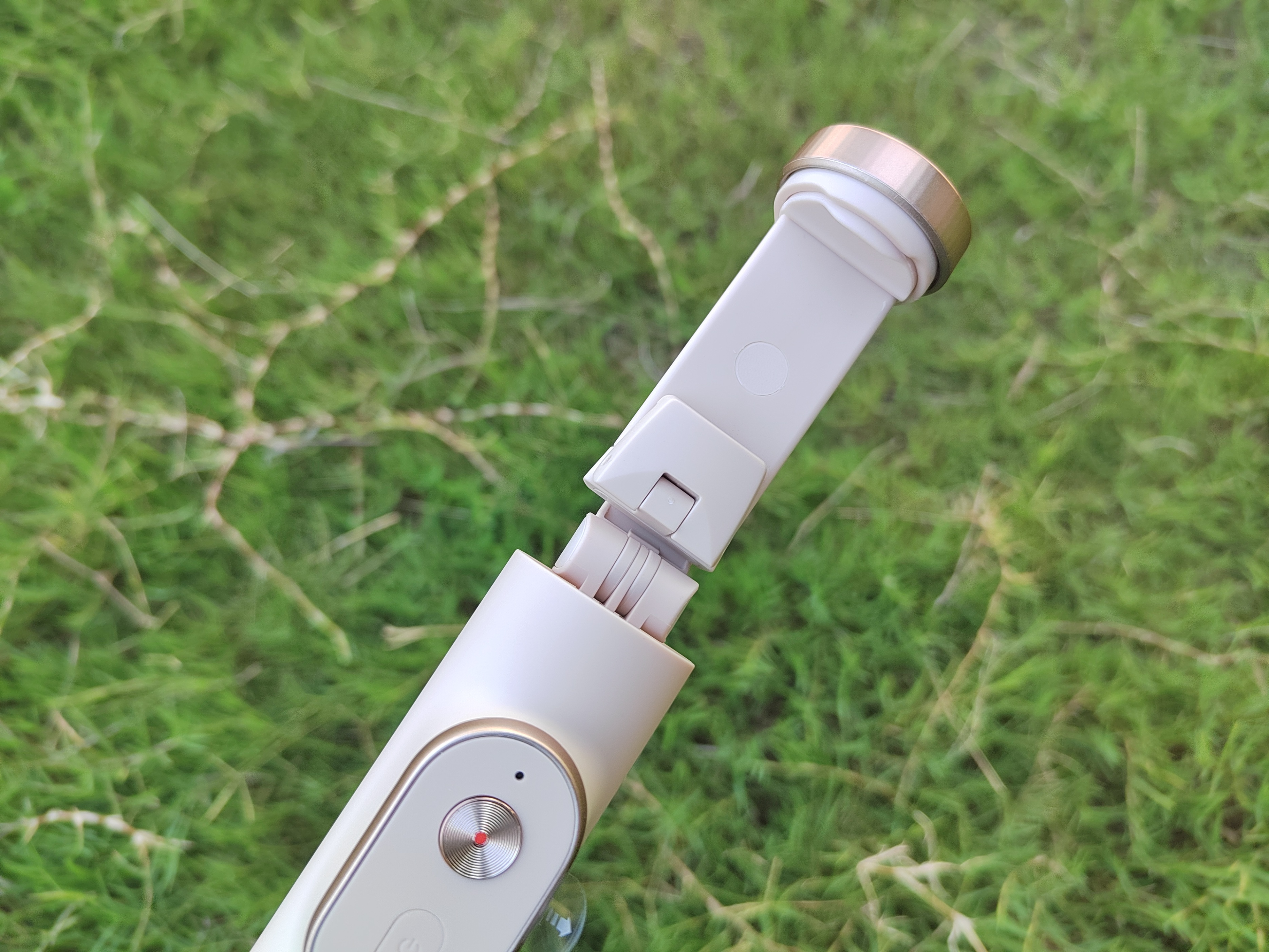 底部内嵌了一颗圆形释键,通过握住自拍杆主体,持续按压释放键即可打开三角支架,我们可以自行控制开合大小。