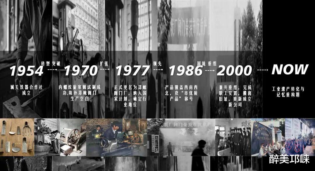 1954年城关铁器合作社成立;1970年内螺纹旋塞阀试制成功,填补邛崃阀门生产空白,正式更名为邛崃阀门厂;1977年纳入国家计划,确定行业地位;1986年产品覆盖西南西北,获“市优质产品”称号;2000年兼并重组,完成职工安置,搬离旧址,重新成立新公司;目前正在进行工业遗产转化与记忆重构。