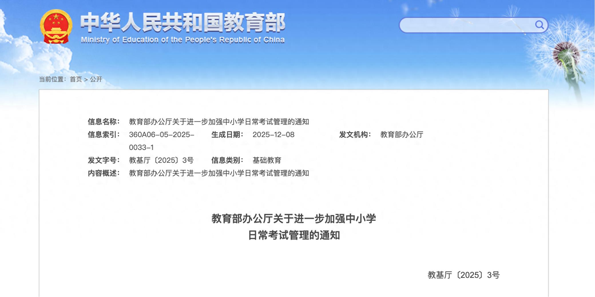 近日,教育部印发《关于进一步加强中小学日常考试管理的通知》(以下简称《通知》),要求减少日常考试测试频次,提升日常考试质量,强化考试安全风险防范,减轻学生过重学业负担,促进学生全面健康发展。具体内容一起来看——