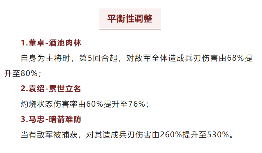 马忠的战法可以说非常强,但因为概率的问题,本次增强基本可以忽略,因为35%概率准备1回合+60%多概率捕获单人+第2次发动后还要捕获的同1个人,8回合可以说这个530%兵刃伤害能命中1次都难。