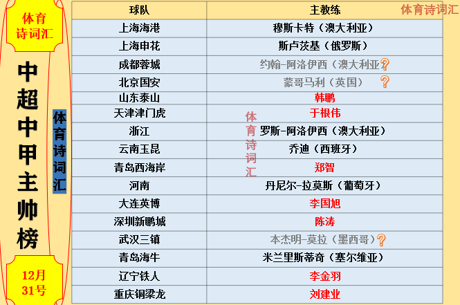 山东泰山将继续由【韩鹏】执教,去年以代理身份执教半年,获得中超第五。天津津门虎的【于根伟】将连续六年执教球队,连续两个赛季带队斩获中超第六名的佳绩。青岛西海岸的新帅大概率就是前国脚【郑智】,长期担任中国男足助理教练,曾执教过广州队。大连英博与【李国旭】完成续约,李国旭转型以来一直都在大连,,此前曾执教过大连超越、大连阿尔滨等队。深圳新鹏城也与【陈涛】完成续约,这也是陈涛第二次担任中超主教练,此前执教过深圳队。辽宁铁人继续让【李金羽】带队,刚刚带队获得中甲冠军。重庆铜梁龙则选择【刘建业】执教,明年将是他首次执教中超。