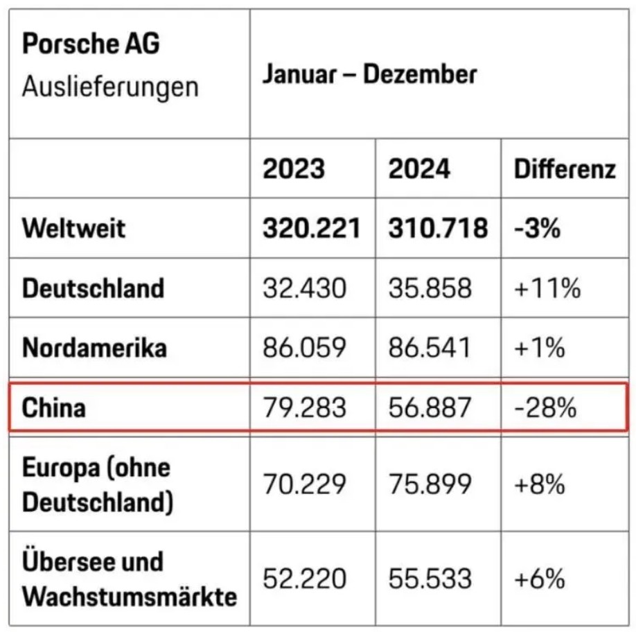 而保时捷方面,在耗尽了tycan短暂的高端电动红利之后,保时捷全球销量开始出现下滑,而中国市场的断崖式下跌尤为致命:2024年仅交付5.69万辆,同比暴跌28%,从2015年起连续三年失去“全球最大单一市场”宝座。不夸张的说,中国市场以一己之力拖垮了保时捷全球销量。这直接导致了保时捷股份的34亿欧元减值。