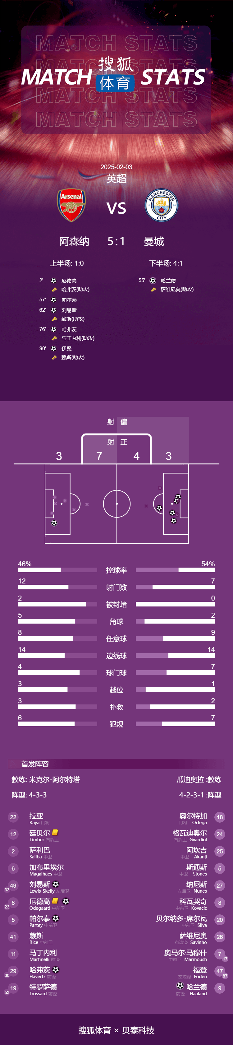 全场比赛结束,最终阿森纳5-1曼城。
