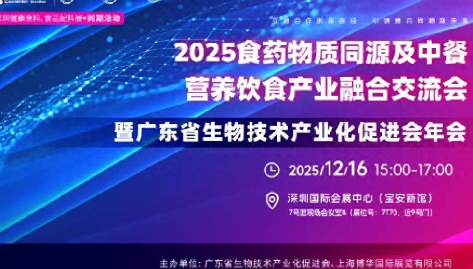 冬日暖阳万物藏,岁月沉香悦时光。2025年12月16日下午,由广东省生物技术产业化促进会、上海博华国际展览有限公司主办的“2025全球食药物质同源及中餐营养饮食产业融合交流会暨广东省生物技术产业化促进会年会在深圳国际会展中心(宝安新馆)隆重举行,出席此次活动的领导和嘉宾有:中国科学院广州分院原书记、省部共建华南应用微生物国家重点实验室主任、广东省生物技术产业化促进会首席专家郭俊;英国皇家物流与运输学会、山东济南市院士工作站负责人杨祖惠;广东省生物技术产业化促进会会长蔡婉生;澳大利亚中医药商会、永远荣誉会长蔡孟汕;广东发展中医药事业基金会理事长贺振泉、南阳市仲景健康产业促进会副会长郭启朝、中国老龄产业协会康养规划工作委员会秘书长李戈、澳门国际科学院院务委员肖盛龙以及来自全国各地的企业代表、社会精英人士共计三百余人,大家齐聚一堂,畅所欲言,就食药物质同源及中餐营养饮食产业融合进行了深度的对话与交流。