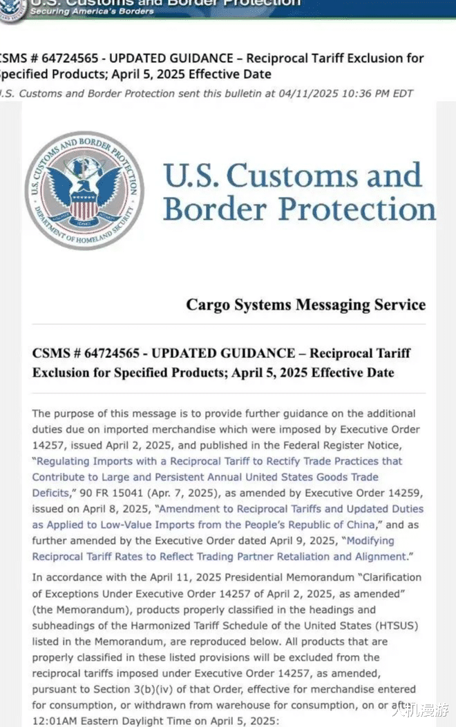 昨晚(4月11日),美国海关和边境保护局(CBP)突然发布新规:智能手机、电脑、半导体、存储设备等电子类产品,全部豁免特朗普的125%“对等关税”!