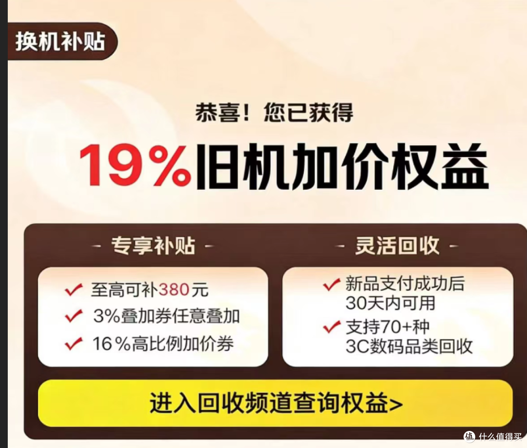 然后就是手机回收换机补贴,给我的旧机估价230圆,当然了,当时是200圆左右买的,但是估价不等于实收价,到时候肯定七扣八扣的没多少了。