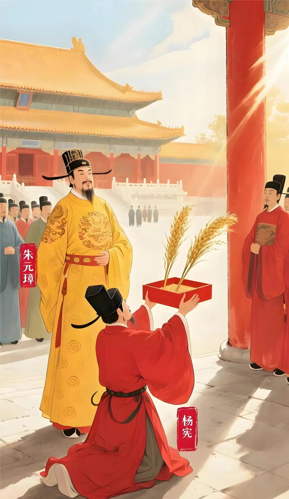 杨宪向朝廷报告自己在扬州的政绩时得到了朱元璋的赞许,他进京述职时还特意将购买的稻穗谎称扬州所产“祥瑞”进献朱元璋。朱元璋得知杨宪把扬州治理得这么好,朱元璋特意为杨宪加官晋爵让他进京做官。朱元璋没想到杨宪的所作所为把他欺骗得好惨,以至于之后他毫不犹豫下令处死杨宪。