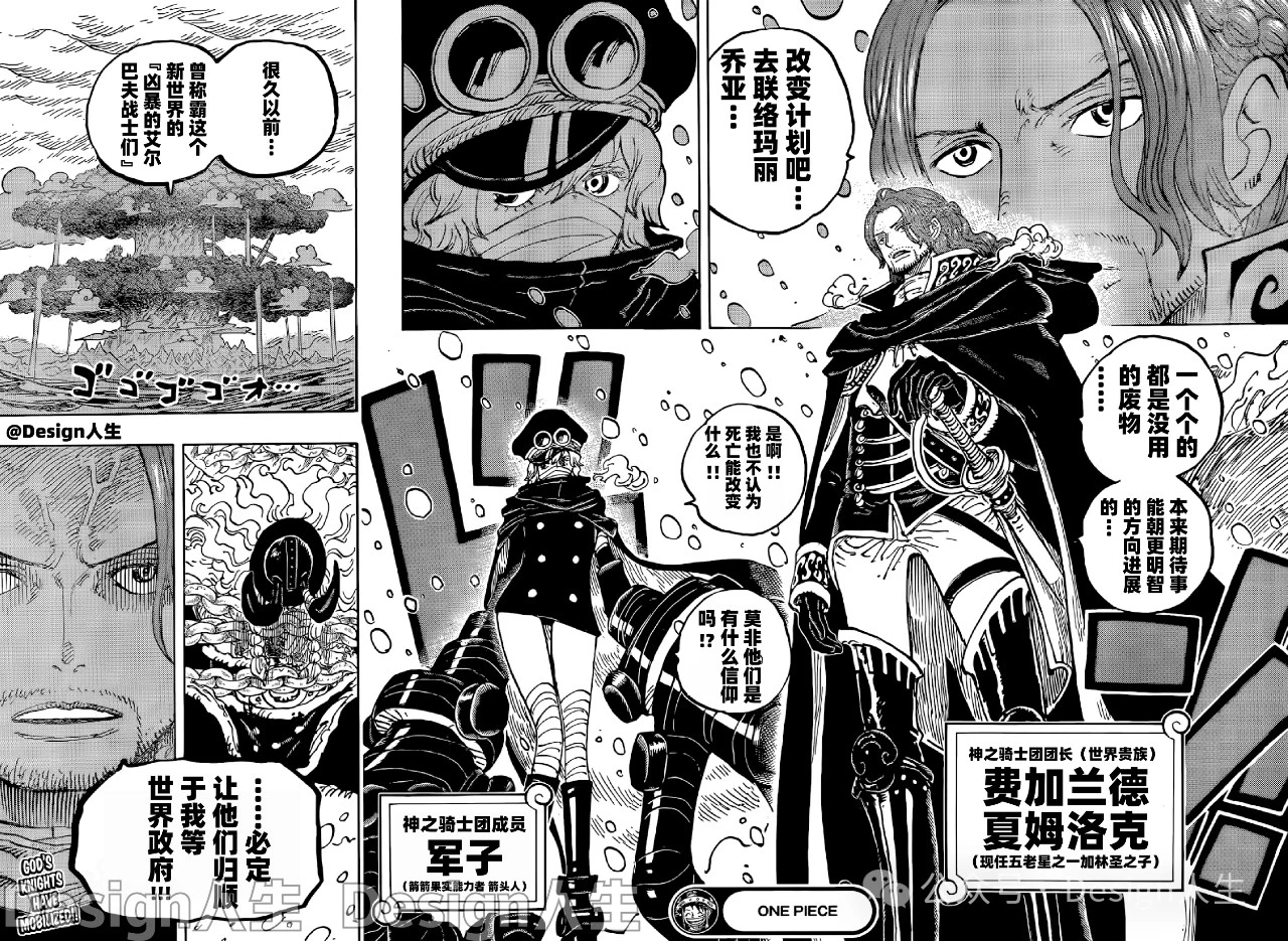 在上一话的结尾,神秘的天龙人来人身份终于曝光,原来他是神之骑士团新任团长夏姆洛克,五老星加林圣的儿子!