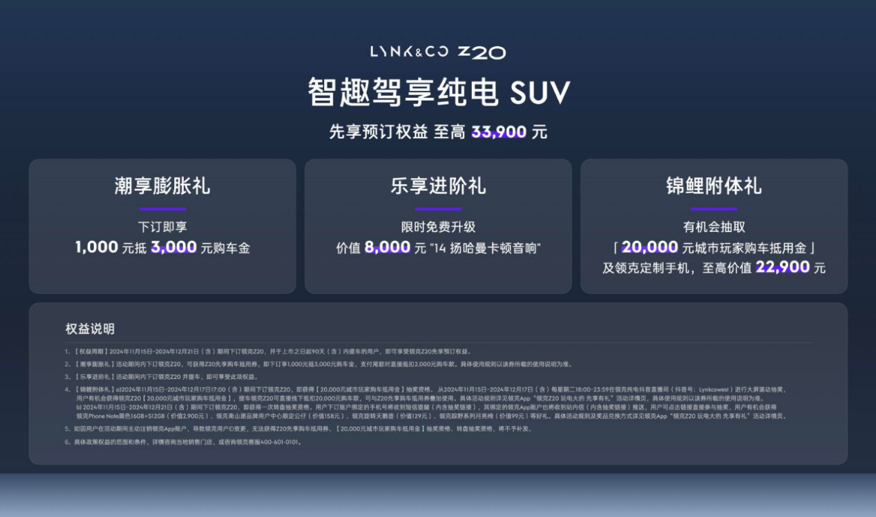 在价格方面,领克Z20展现出了对年轻人的满满诚意。先享预订价仅14.6万元起,下订即享1000元抵3000元购车金的超值优惠。同时,至高还可享受33900元的先享预订权益。