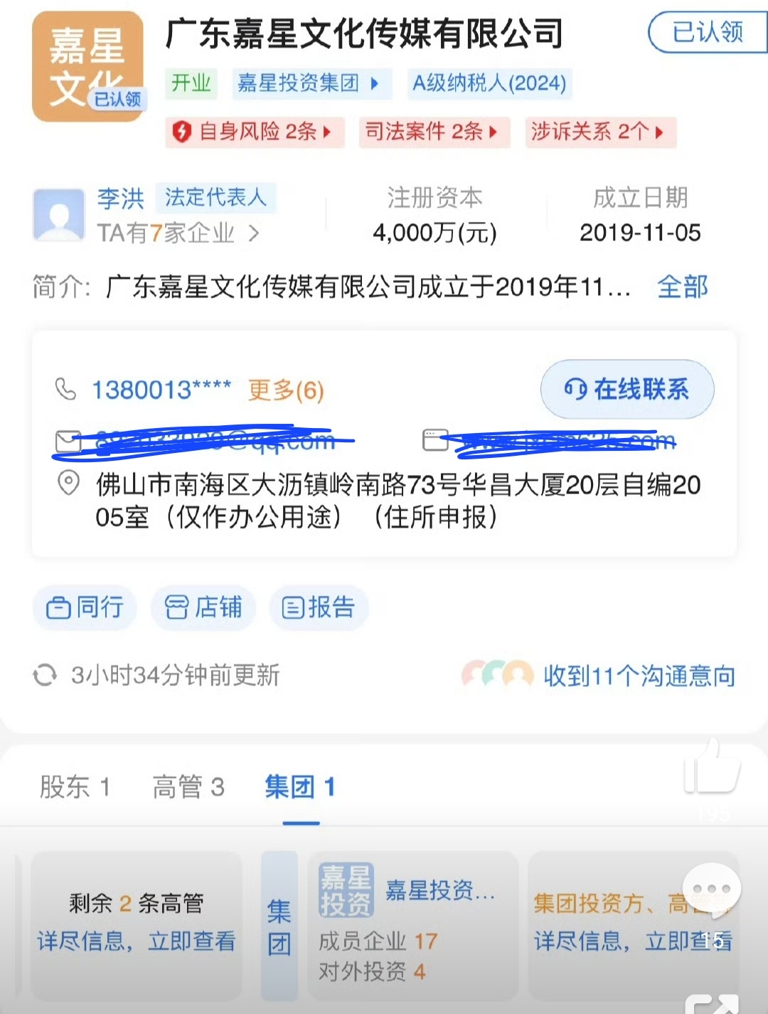 这家传媒公司是由广东嘉星投资集团有限公司全资控股的。