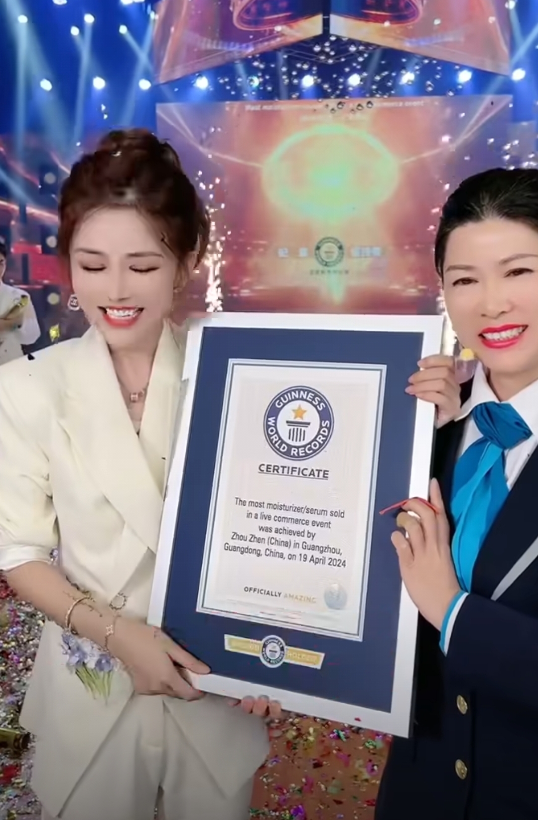 粉丝数高达5044.7万,账号上还挂着“吉尼斯水乳精华销量王”“平台国补合伙人”的认证。