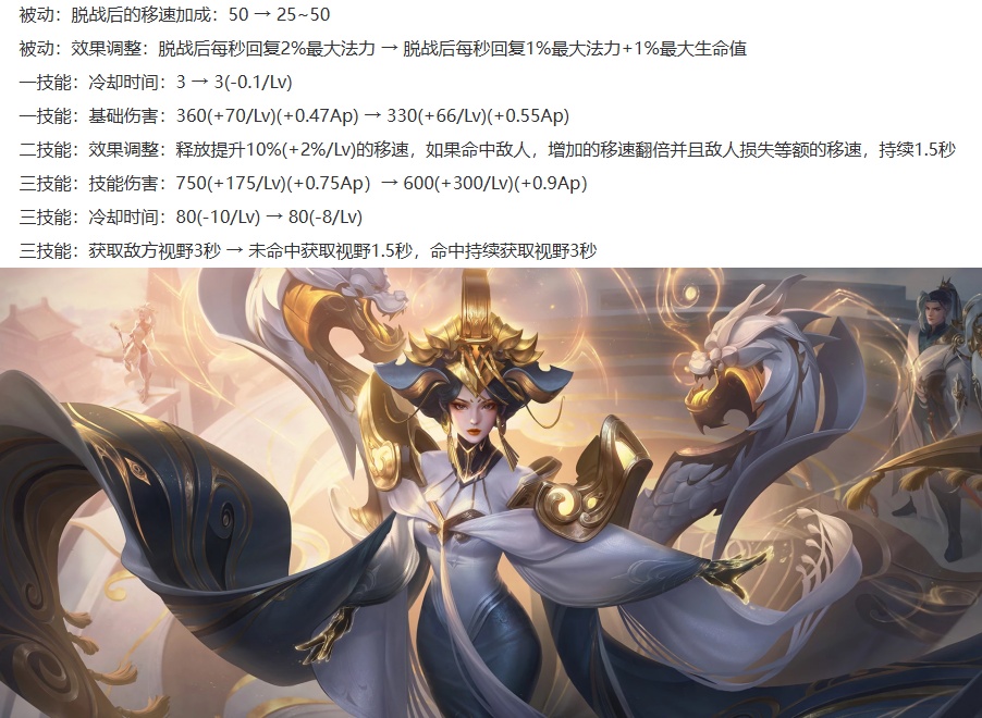 武则天变异:脱战后的移速和回蓝降低,新增脱战后回血,1技能的CD缩短0~0.5秒,1/3技能的前期伤害降低,后期伤害增加,2技能新增未命中也增加移速。