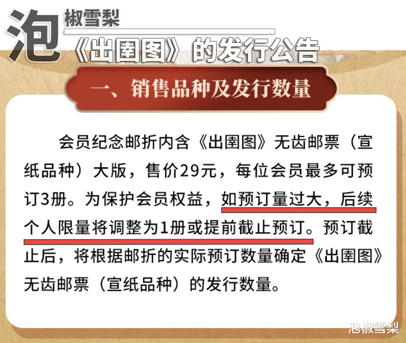 其实从收到邮政的《出圉图》短信开始,这场盛宴就在邮政的“预想”之下隆重拉开序幕,有利可图是吸引圈外人的关键,有了《货郎图》这个先例,大家潜意识里自然觉得《出圉图》不会差到哪里。否则邮政也不会在公告中表示“如预订量过大,后续个人限量将调整为1册或提前截止预订”。
