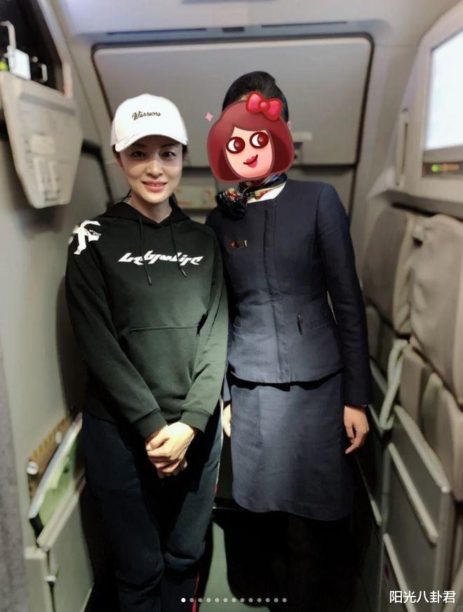 周涛在机上和空姐合影,素颜皮肤状态真能打。衣着十分低调,以舒适为主!