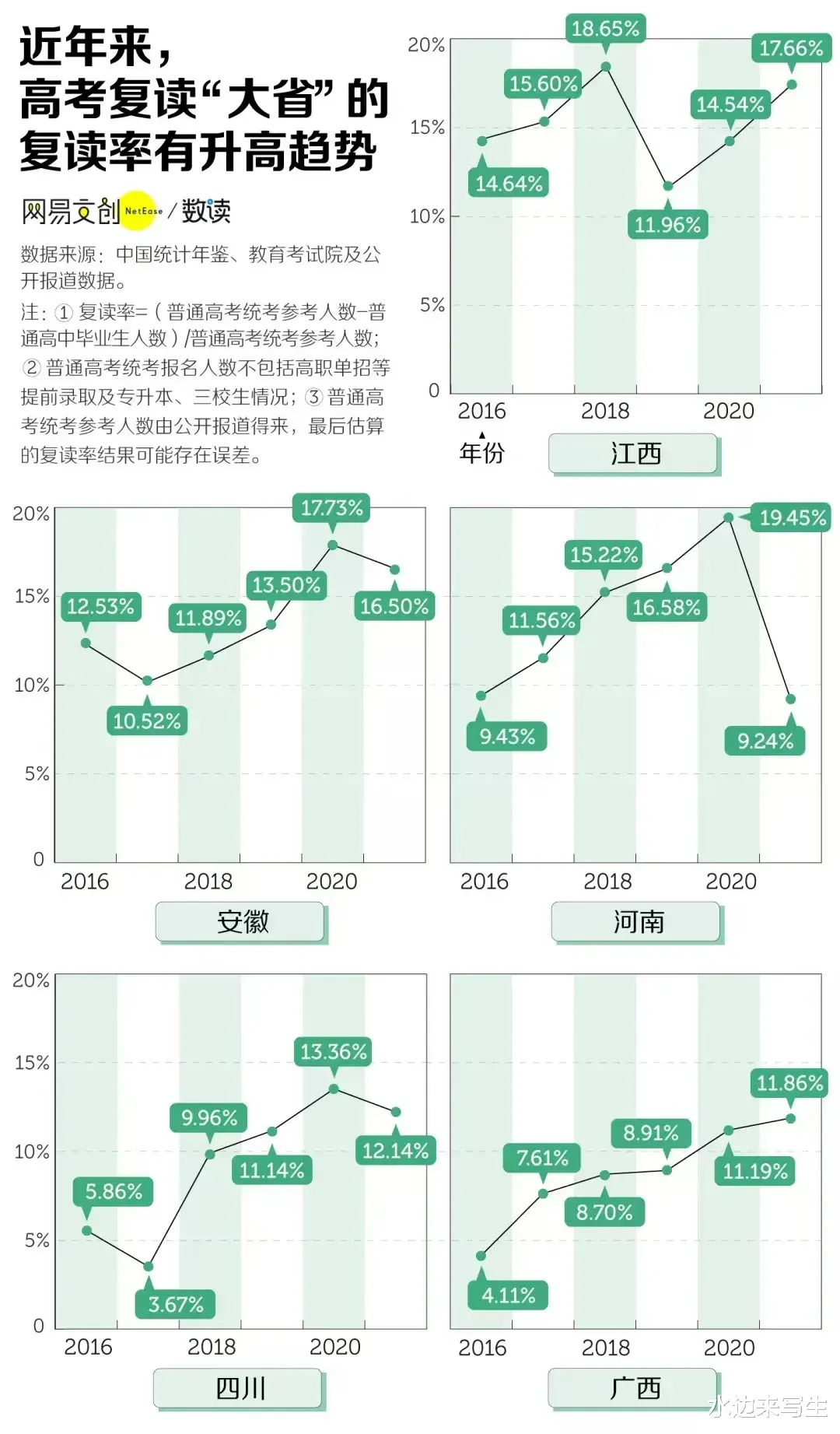 而“复读工厂”毛坦厂中学所在的安徽,悄咪咪紧随其后,复读率约为16.5%。
