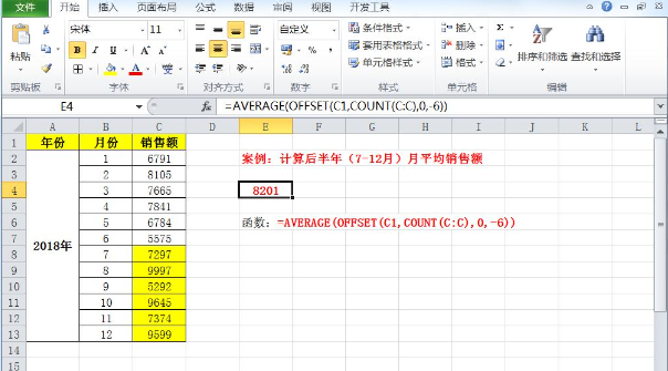 4、第四个参数-6表示从最后一个单元格开始,向上选择6行,得到单元格区域C8:C12。最后,使用 average函数计算平均值。