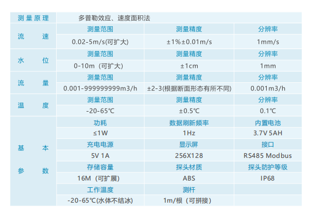 该设备搭载流速、压力式水位计、水温三类核心传感器,为流量计算提供数据支撑。流速传感器捕捉水体流动速度,压力式水位计获取测量点位水深,水温传感器检测水温并为超声声速补偿提供数据,设备结合预设的渠道断面尺寸,即可精准计算断面流量。行业研究证实,固定声源发射的超声波经水体固体颗粒反射会产生多普勒频移,其数值与水体流速正相关,通过检测频移换算流速,让设备在杂质含量较高的渠道水体中也能保证测量准确性。设备核心技术参数适配渠道常规测量需求:流速测量 0.02-5m/s,精度 1.0%±1cm/s,分辨率 1mm/s;水深测量 0-10m,精度 ±1cm,分辨率 1mm;水温测量 - 20℃-65℃,精度 ±0.5℃,分辨率 0.1℃;流量测量 0.001m³/s-999999999m³/s,精度 ±3%,分辨率 0.001m³/s。设备采用直流 10V-24V 供电,12V 供电时工作电流小于 0.1A,配备 RS485(Modbus-RTU)接口,2M 基础存储可扩展;防护等级 IP68,工作温度 - 20℃-65℃(无结冰),存储温度 - 35℃-75℃,防腐材质外壳适配野外使用。