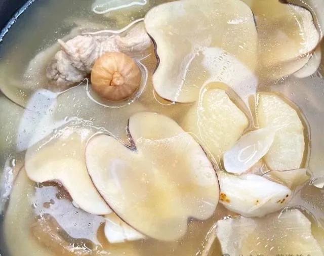 4、煮20分钟,捡去葱结,放山药,开中火沸腾后再转小火