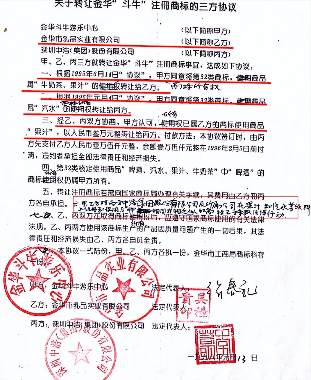 为解决“斗牛”商标的障碍,1996年1月,中浩公司利用与金华斗牛中心同属于轻工系统国有企业的便利,与之建立联系,协商购买斗牛商标。但此时,金华斗牛中心已经将“斗牛”商标的部分权利转让给了金华市乳品实业有限公司(简称“金华乳品公司”),严彬先生委托中浩公司与金华斗牛中心、金华乳品公司共同协商购买斗牛商标,相关资金由严彬先生个人垫付,最终于1996年1月签署购买斗牛商标的三方协议:1996年1月13日,三方共同签署《关于转让金华“斗牛”注册商标的三方协议》,约定金华斗牛游乐中心将第675058号斗牛注册商标 所属第32类商品中“汽水”、金华市乳品实业有限公司将所属“果汁”的所有权以三万元转让给中浩公司,并承诺对中浩公司及其所属公司(即中国红牛)在果汁、汽水等饮料上使用与斗牛商标相同或近似的商标不采取法律行动。