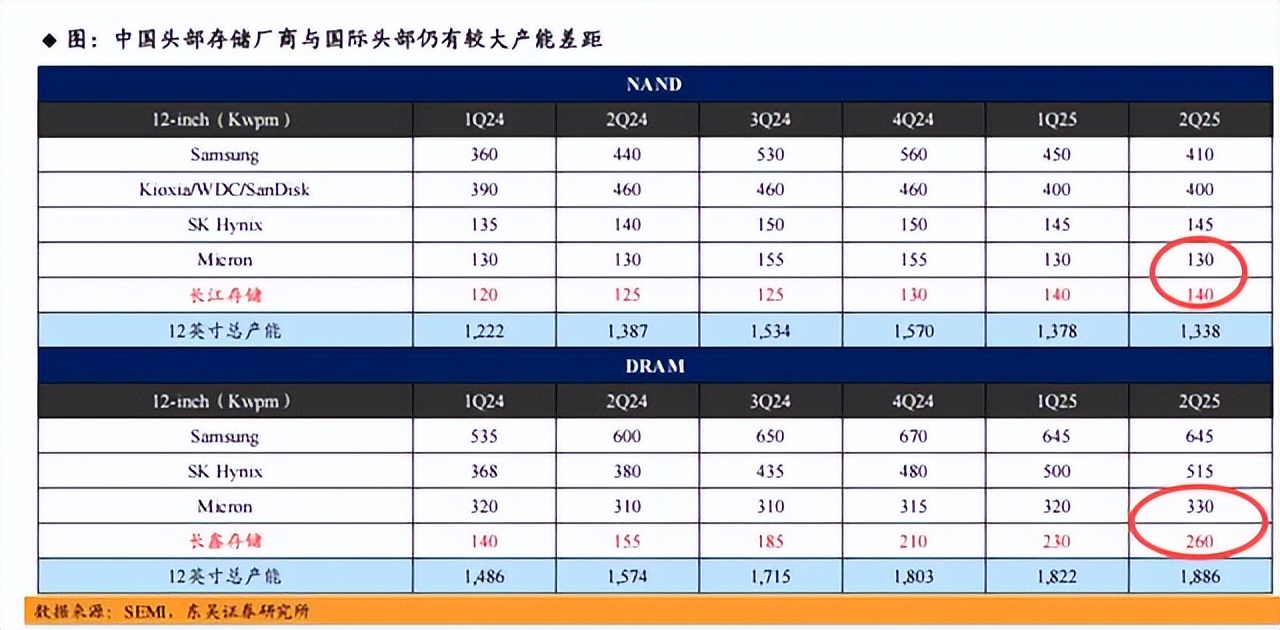 可以看到,在NAND闪存领域,中国长存的产能为14万片每月,高于美光,低于三星、铠侠、SK海力士,排在第四名,份额超过10%。