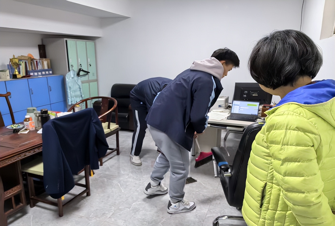 课间操的号角落下,各班迅速行动,一部分同学走进教师办公室,细心擦拭桌椅、整理文件、清扫地面,用双手为辛勤耕耘的老师们营造整洁舒适的办公环境;
