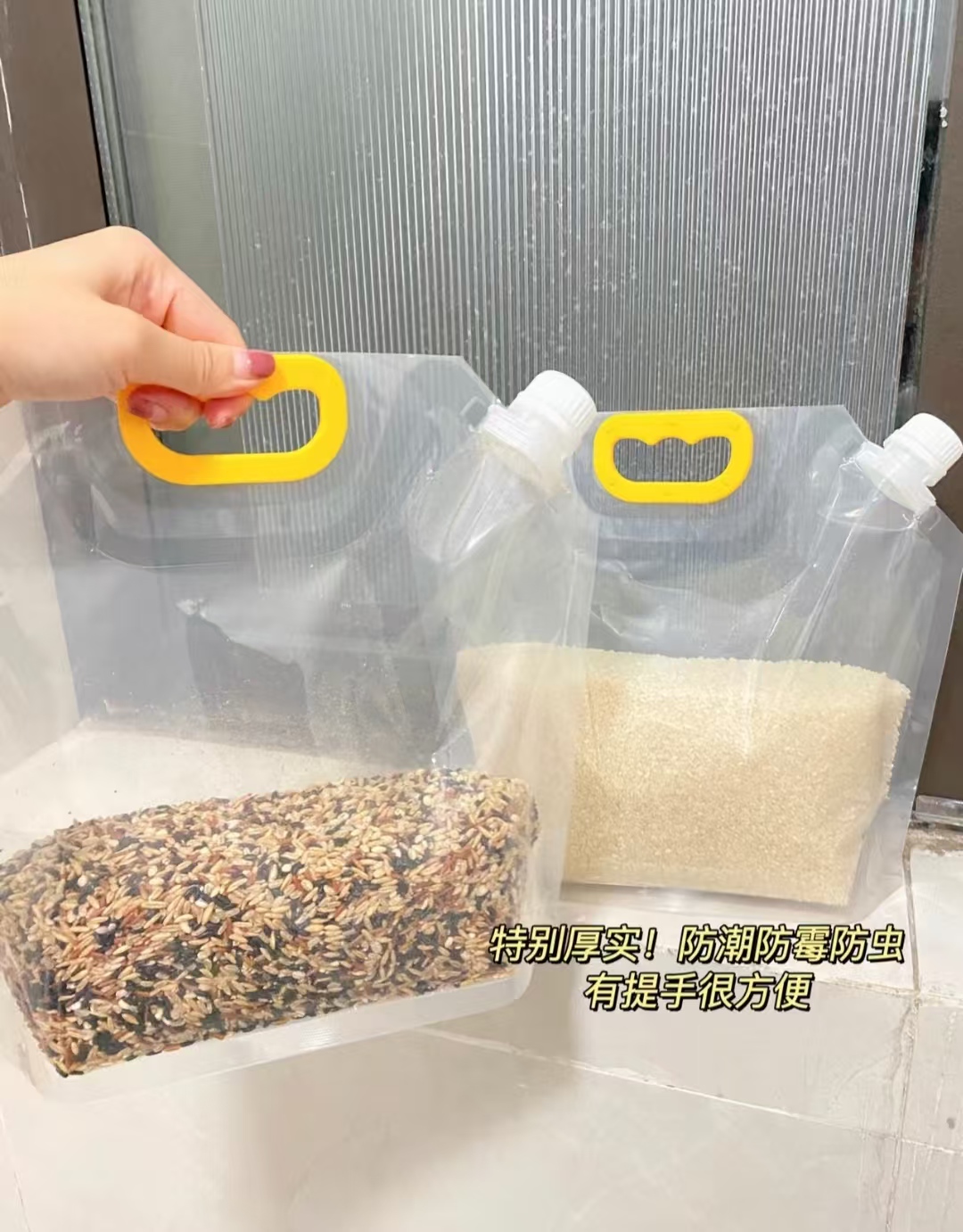 透明的材质,很厚实,密封性好不用担心受潮发霉,装好杂粮后也不是软趴趴的那种,可以直接立起来放置,一目了然,拿取方便。