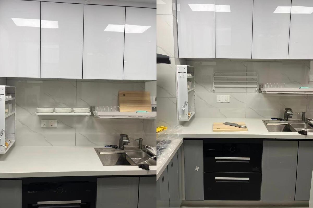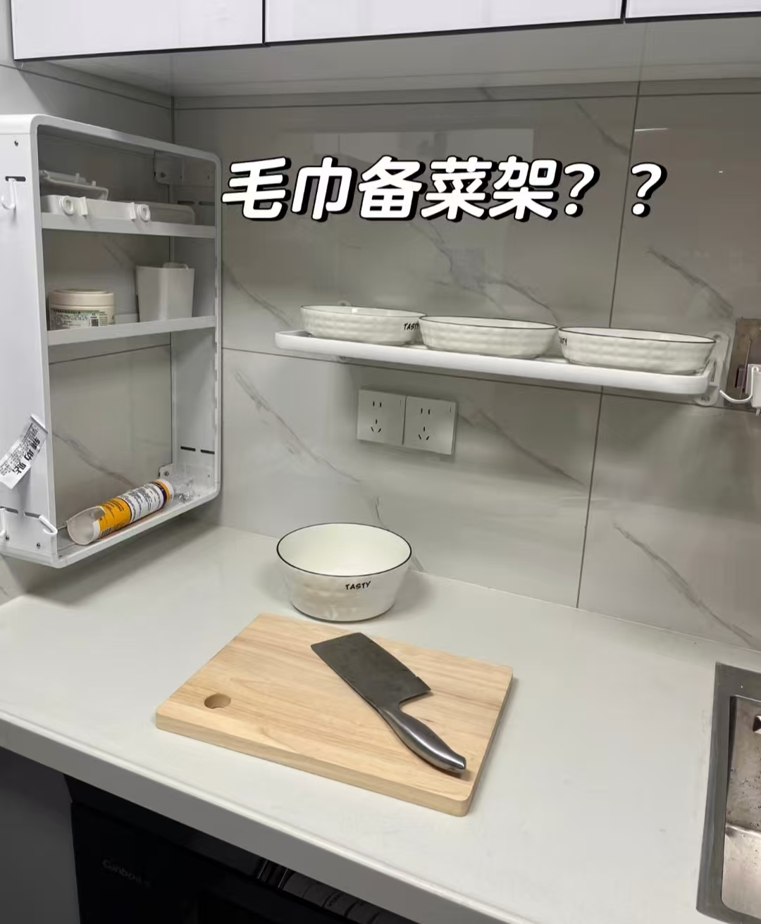 老妈在拼夕夕花几块钱买了个普通的可折叠单层毛巾架,装到常用的备菜区上面;可以放三个常规大小的盘子,也可以当做临时放菜的地方,不用的时候直接收起来也不占空间。
