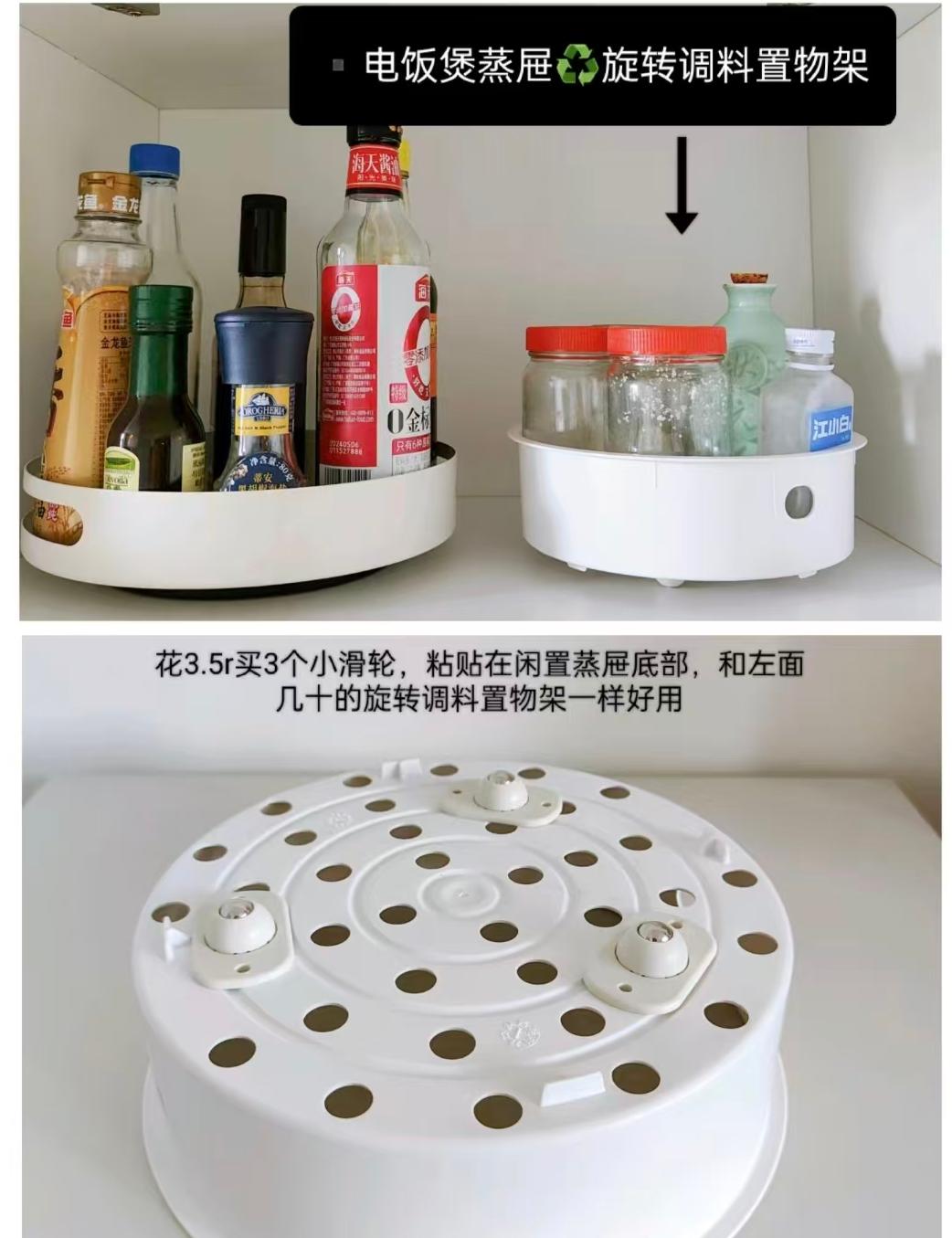老妈把之前买的小万向轮粘贴在蒸屉底部,放在厨房里就和专门买的调料旋转架一样了。