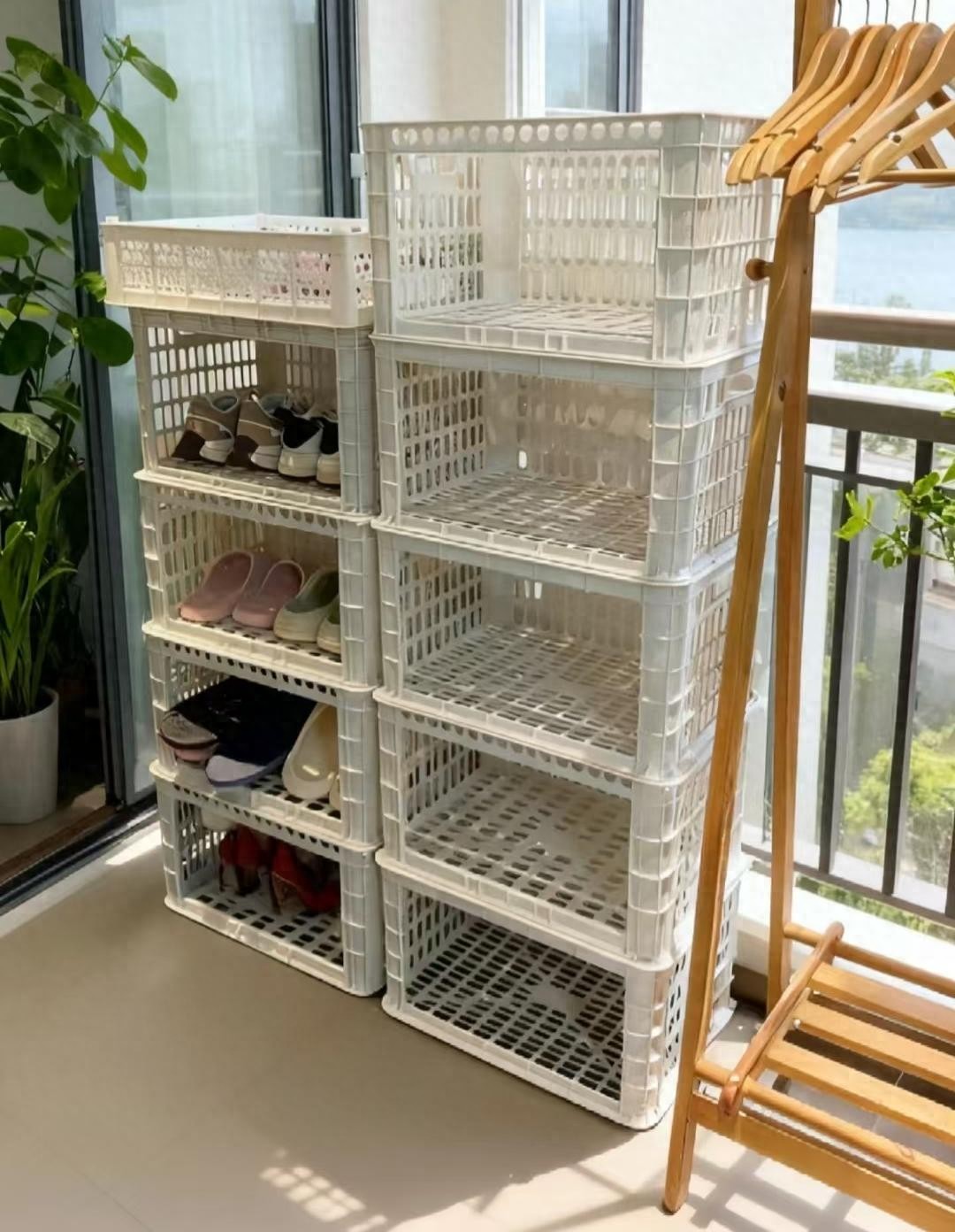 老妈直接到楼下的水果店里买了两筐水果顺便又多要了几个水果筐。老妈把几个水果筐上下叠放到一起再用扎带扎紧,侧面开口,一个干净利落的鞋架就好了。